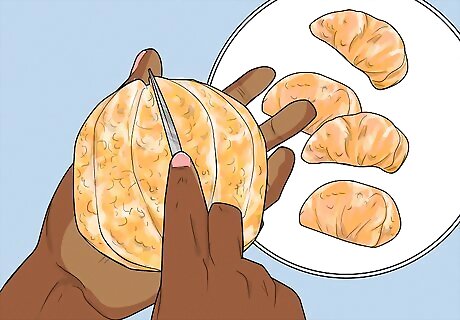 Peel the fruit. Tangelos have a thin and smooth skin that makes it easy to peel. You can start at the top of the tangelo by digging your fingernail or knife under the skin. Then, slowly begin to peel the layers back until all of the skin has been removed. You don’t have to peel neatly unless you are planning to use the rind for something.