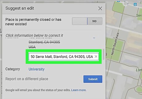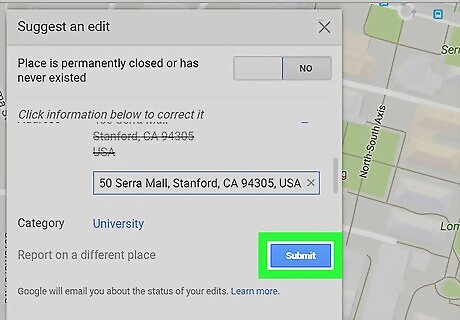 Make your edit suggestions. You can update the name, address, category, location, contact number, hours, and website. Just click the current entries to make your edits. If a business or location no longer exists, click the slider next to “Place is permanently closed or has never existed.” If the place’s marker on the map is in the wrong spot, check the box next to “Marker is placed incorrectly on the map.”