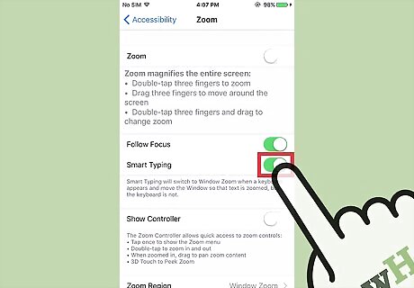 Slide the “Smart Typing” switch to the on position. Now the Zoom feature will zoom into the text you’re typing instead of just enlarging the keyboard.