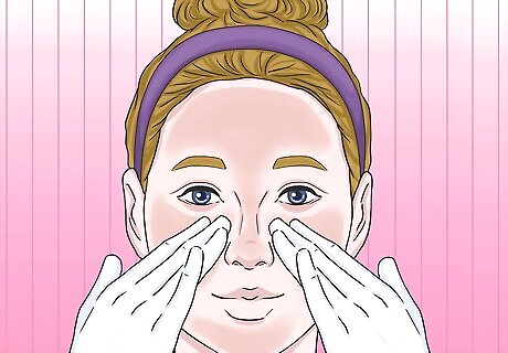 Begin with the areas that typically tan first. The areas that receive the most sun are your forehead, your cheeks, your nose, and your chin, so begin with those areas with your fake tan. Rub the tanner into these areas in a gentle circular motion. Apply it gently to the area around your nostrils, including your upper lip. The driest areas of your face, such as the skin around your nostrils, will absorb the tanner more readily. When applying the tanner to these areas, be gentle.