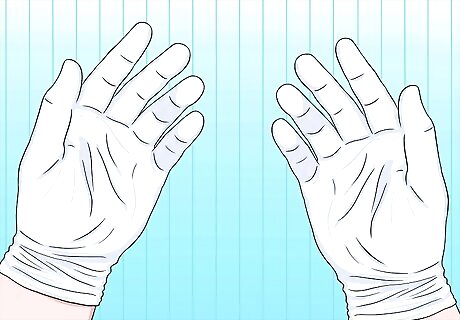 Put gloves on to protect your hands. If you apply the tanner without gloves, you're likely to end up with orange-tinted hands, a dead giveaway. Don some latex or nitrile gloves to avoid this situation. You should still wash your hands afterwards, even if you do put gloves on. If you're using a gradual tanner, such as a moisturizer with a tanner in it, you likely won't need the gloves, but you should wash your hands after applying it.