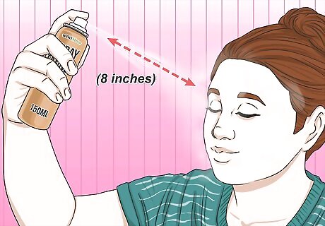 Hold the can about 8 inches (20 cm) from your face when spraying. If you get the can too close to your face, it can create blotches. It may even cause the tanner to run down your face. Keep the can out a bit, so you get a nice, even coverage. Think about how you'd apply spray paint. Hold it away from your face and move it back and forth as you move down your face, creating an even cover.