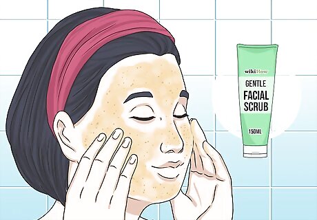 Apply a scrub or peel to exfoliate your face. For a scrub, pick a light facial scrub, and rub it into your face. Rinse it off afterwards. For a peel, choose one that's gentle on your skin and made from AHA. Apply it to your face, and leave it for the amount of time the package says before rinsing it off. "AHA" refers to "alpha hydroxy acid," which is what works to remove the dead skin. Typically, you'll find exfoliants with AHA, BHA (beta hydroxy acid), or a combination of both. Opt for the AHA formula, as it is oil-free. Picking an oil-free formula is important, as oils can make it more difficult for your skin to absorb the tanner. Look for exfoliants that describe themselves as "gentle" or "for sensitive skin." You want something gentle, as anything too harsh could remove too much skin and cause streaks. Dead skin cells can result in an uneven tan. Plus, if they slough off after your tan, it will fade much quicker. A light exfoliation will help prevent this issue.