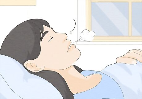 Practice deep breathing exercises. By concentrating on your breath and controlling it, you can slow your heart rate and lower your blood pressure, thus prepping your body to get back to sleep. While lying down on your back, relax all the muscles in your body as much as you can. Inhale slowly through your nose, concentrating on filling the bottom of your chest cavity with air. You should see your stomach rise instead of just your chest. Do this in a slow, controlled manner, taking 8-10 seconds. Hold your breath for 1-2 seconds. Relax and let the air escape your chest at a natural rate. Repeat this process until you feel yourself drifting back to sleep.