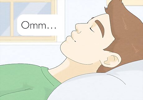 Use a calming mantra to ease anxiety. A mantra is a sound that's repeated in an effort to focus attention away from distracting thoughts. The most common mantra is the sound "Om," though you can use any sound that is relaxing and simple. Mantras draw your focus to 1) the action of producing the sound, 2) the tactile feeling of producing the sound with your mouth and throat, and 3) the soothing sound produced. Lie down in bed and close your eyes. Take a deep breath to fill slowly fill your lungs, drawing air into the bottom of your chest cavity. You should see your belly rise, not your chest. Say "Om," holding the "o" sound for as long as is comfortable. Focus solely on the three dimensions of the mantra — action, feeling, and sound. Think about those three things until everything else falls away. Rest for one second in silence. Repeat until your anxiety has waned.