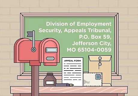 Submit your appeal form. If you're appealing the denial online through the UInteract system, simply click a button to send your appeal request to the Department of Labor. If you printed out a form, you'll have to submit it using mail or fax. Mail your completed appeal to Division of Employment Security, Appeals Tribunal, P.O. Box 59, Jefferson City, MO 65104-0059. You can also fax your appeal to 573-751-1321.