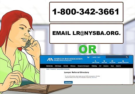 Contact the referral service. You can get a referral by contacting the referral and information service at 1-800-342-3661. Alternately, you can email [email protected]. This referral service only covers certain counties. If you live in a county not covered by the bar association, they will give you a number to call. You can also find numbers for local bar associations here: https://www.americanbar.org/directories/lawyer-referral-directory/lawyer-referral-directory.html?q=inmeta:STATE_SERVED%3DNew%252520York.