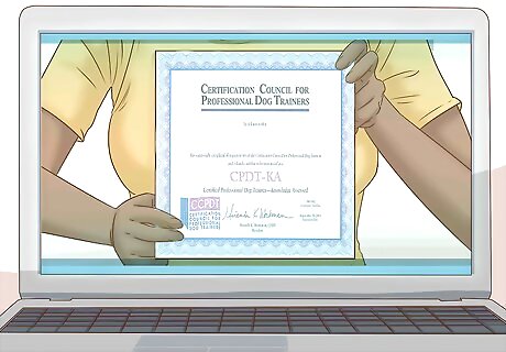 Use a certified dog trainer directory. Many dog organizations provide directories of certified dog trainers. You can use these directories to start your search for a good dog trainer. You can search by state or country and zip code to find a trainer in your area. For example, you can try searching through the Certification Council for Professional Dog Trainers at ccpdt.org or The Association of Professional Dog Trainers at apdt.com.