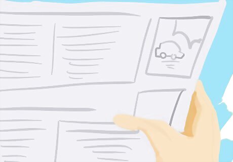 Check the newspaper. Your local newspaper will be able to put you in touch with local individuals who have a used car to sell. Check out the classifieds section to look at the cars for sale, paying attention to price, make, and description. Due to character counts, the descriptions might be fairly scant, so you should be prepared to ask for more details when you contact the seller. If you do not receive the newspaper on your doorstep, go to a gas station or drugstore and buy a copy there. If you do not want to buy the paper, ask a neighbor or someone you know to save the classifieds for you.