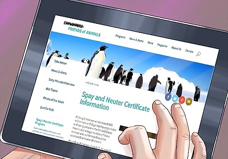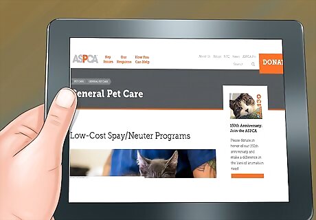 Sign up with Friends of Animals. Friends of Animals is a national organization that works to control pet overpopulation. On their website, you can purchase a certificate for a procedure that is good at any of their affiliate locations. You can also search on their website for local providers that work with them. Be sure to search the website first to establish that there are providers in your area that work with the organization. The certification, which covers the entire cost of the procedure, is $61 for a male cat and $85 for a female cat.