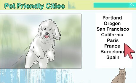 Check pet-friendly cities. Some cities are known for being more pet-friendly, such as Portland, Oregon and San Francisco, California in the U.S.; Paris, France; and Barcelona, Spain. Although the city itself being pet-friendly does not automatically suggest all motels or hotels will be similarly accommodating, it does make it more likely to find pet-friendly locations. Most pet-friendly cities are well established as incredible vacation destinations, or are known as up-and-coming getaway destinations. There truly is no reason not to have a great vacation with your pets.