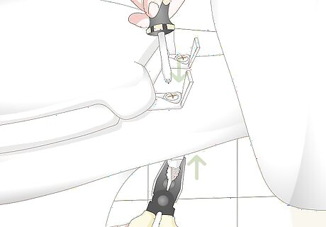 Secure the nut with pliers and insert a screwdriver into the bolt head. Grab a small set of pliers that will fit into the tight quarters on the underside of the bowl. Use them to grasp the nut firmly in place. Choose a screwdriver with a tip that matches the notches on the head of the bolt and insert it into the notches. Hold the screwdriver in one hand on the topside of the bowl, and the pliers in your other hand on the underside.
