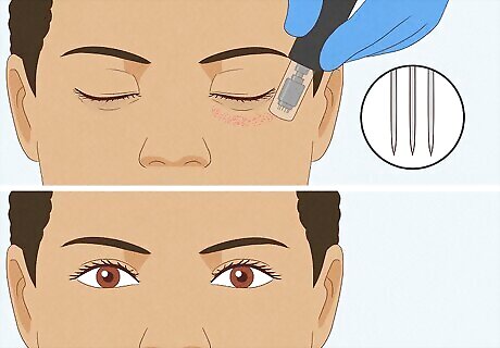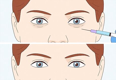Get microneedling to increase collagen production. Microneedling is a cosmetic treatment that involves using tiny needles to make microscopic wounds on the skin. These wounds lead to increased collagen production, which helps get rid of sunken eyes by naturally strengthening your skin. According to board-certified plastic surgeon Daniel Barrett, MD, microneedling “can thicken the skin so that the appearance of the wrinkles and the underlying blueish color will be less noticeable.”