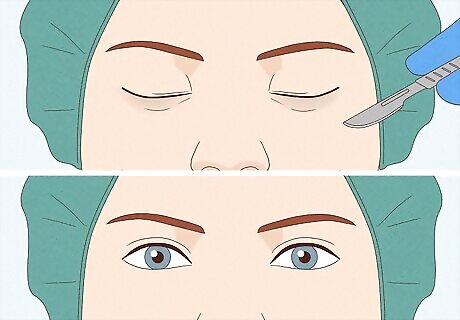 Get blepharoplasty (eyelid surgery) to remove excess skin around the eyes. According to board-certified plastic surgeon Asif Pirani, MD, a blepharoplasty is a cosmetic eyelid surgery that removes the excess skin that stretches around the eyelids as you age. By removing that excess skin, you can cut sunken eyes off at the source and give yourself a rejuvenated look. Dr. Pirani says the procedure is a bit more complex around the lower eye, as the protruding fat in the eyelid must be reduced or repositioned. The lower eyelid also occasionally has to be tightened.