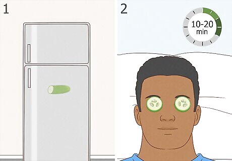 Place cucumber slices under your eyes to minimize puffy bags. Doing a cold compress with cucumbers helps reduce swelling and inflammation, mitigating those sunken eyes. Grab a cold cucumber from the fridge, chop a small piece into two slices, then place them on your eyes for 10-20 minutes. This will help rejuvenate the moisture in your eyes, with the added benefit of lowering irritation.