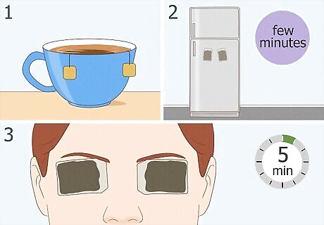 Place tea bags under your eyes to promote blood circulation. Warm tea bags can help bring down puffiness by circulating the blood throughout your blood cells with their antioxidants and flavonoids, making them smaller and removing that darkness from your sunken eyes. Just soak the tea bags in warm water as if you were going to make tea and chill them in the fridge for a few minutes. Then, place them directly onto your eyes for 5 minutes.