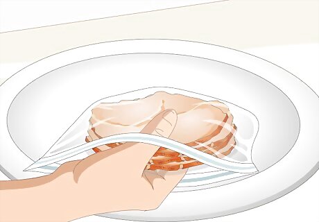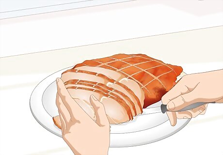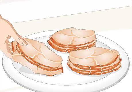 Separate the slices or pieces into serving sizes. On a large plate, make several groupings of single servings of the ham. A single serving of ham is 3 ounces (85 g), which is roughly the same weight as a deck of cards. Serving sizes can also be generally measured as being the same size as the palm of your hand as well, though this might be harder to use as a guide for slices of ham.