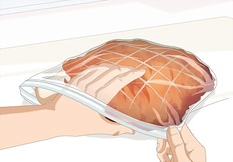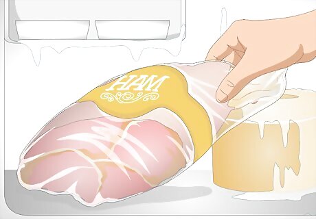 Keep uncooked ham portions in their original packaging. If you buy a whole ham or portions of a ham from the store and do not plan on cooking them relatively soon, you can simply put them into the freezer as long as the original packaging has not been broken. If the original packaging opens, you will have to further wrap the ham to protect it from contamination and freezer burn.