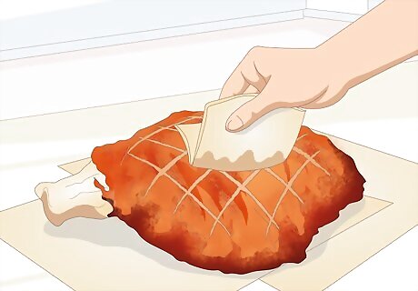 Dry the ham off with a paper towel or cloth. Though cooking takes away much of the moisture present in uncooked ham, you will still need to remove as much of what is leftover from the surface of the ham as possible. Excess moisture can cause freezer burn and toughness, which will affect the taste when you thaw and reheat it.