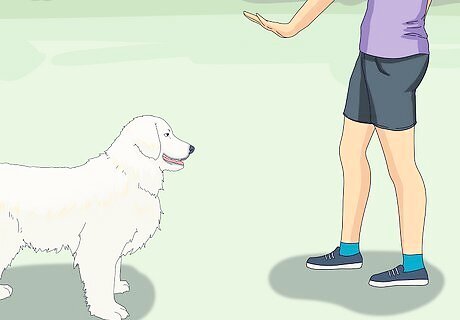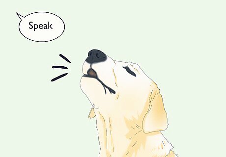 Induce your dog to bark. Make your dog bark by either making a barking sound, or by doing something that sets off the barking, like ringing the doorbell or knocking on the door. While your dog is barking, say a cue word, like “speak” and give your dog a treat. To reinforce the speak command, use a distinctive hand signal that will cue the command, for example, like waiving your hand or a pointer finger in the air. Say, “speak,” again until your dog begins to bark. Reward it for barking by giving it a treat. Repeat this step until your dog understands the “speak” command.