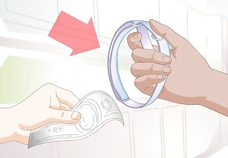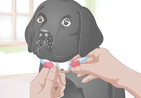 Place the collar or harness on your puppy. When your puppy is calm, gently put the collar or harness around its neck. Check the fit by putting 2 fingers between the collar and your puppy’s neck. If your fingers don’t fit, the collar or harness is too tight. If your fingers fit snugly, the collar or harness is just right. Adjust the collar or harness, if necessary. If your fingers still don't fit snugly, purchase another one. Your puppy will probably fuss and squirm when the collar or harness is on. Ignore the fuss. Eventually, your puppy will forget that it’s on.