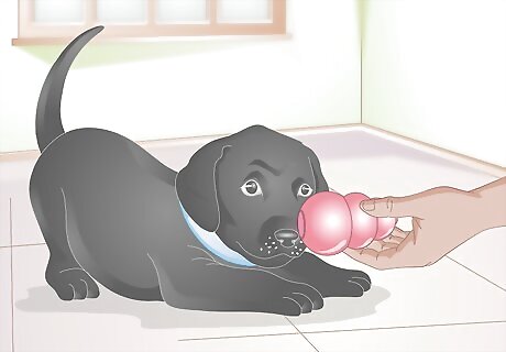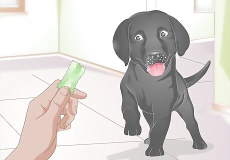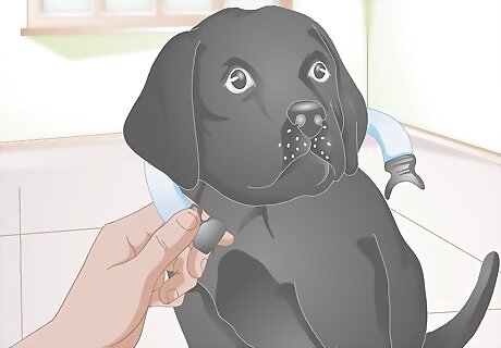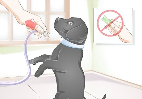 Distract your puppy. If your puppy seems to get squirmy or fussy with the leash, distract your puppy with toys. You can also put the leash on right before a scheduled playtime, or before practicing basic commands (sit, stay). If you put the leash on before playtime, your puppy will start associating the leash with something fun. Small bits of treats can also distract your puppy.
