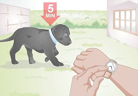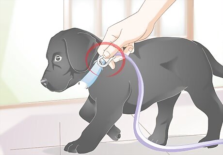 Increase the amount of time your puppy wears the collar or harness. The first day your puppy wears the collar or harness, leave it on for 5 minutes. Practice this several times, with about 45 minutes between practice sessions. Over the next 2 weeks, gradually increase the amount of time your puppy wears the collar or harness. Your puppy does not have wear the collar or harness all day. Because puppies like to run and explore, the collar or harness could be dangerous, since it could get caught on something and cause your puppy to panic. Keep the collar or harness on only during practice sessions. If you’re unsure about how long to leave the collar or harness on your puppy, ask your vet for guidance.