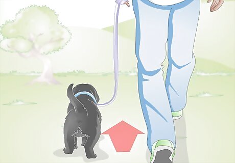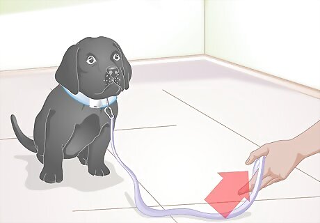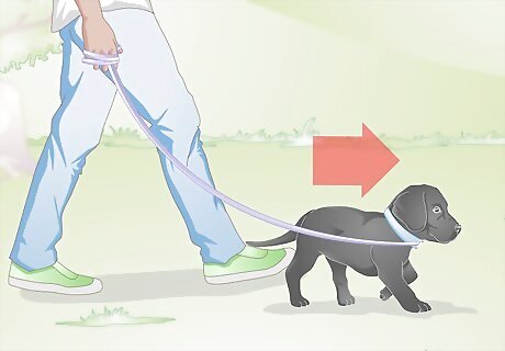 Let your puppy lead you. The first time you pick up the leash, don’t expect your puppy to start walking beside you. Instead, follow your puppy and let it get used to the pressure of you holding the leash. If your puppy starts pulling, turn and walk in a different direction, without yanking the leash. To stop the pulling, you can also stop walking and entice your puppy back to you with a treat. Continue walking after your puppy comes back to you and you give it the treat. Do not pull on the leash yourself. If you start pulling, then your puppy may start pulling, too. Do not hold the leash too tightly as you follow your puppy. A tight leash can actually encourage a puppy to start pulling.