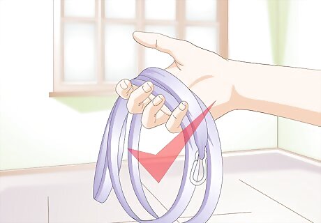 Select a beginner leash for your puppy. After your puppy is comfortable with the collar or harness, it will need to get used to a leash. The first leash you use with your puppy should be lightweight. Cut the loop out of the leash so your puppy’s paws don’t get stuck in the loop. As your puppy grows, you may need to buy a bigger and sturdier leash.