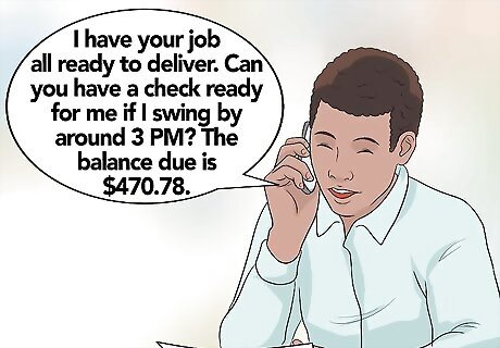 Make arrangements for payment before you deliver the final product. Hold back enough so that they will need to pay you before you deliver the finished job. It is not unprofessional for you to do so, though many business owners consider this a "low-rent" practice. It's not low-rent - it does not telegraph to your clients that you cannot afford to await payment. Rather it lets them know that you are a professional accustomed to being paid for your work on time. Just say something like, "Hey, Mr. Jones, I have your job all ready to deliver. Can you have a check ready for me if I swing by around 3 PM?. The balance due is $470.78."