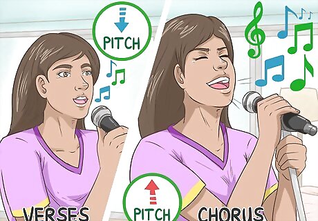 Create contrasting rhythms and tunes to give your song variety. While a song’s verses repeat a melody, the chorus presents an opportunity to add contrast. In many great songs, the chorus surprises the listener with tunes and rhythms that leap out from the verses. Contrast is the key to the verse-chorus relationship. One musical passage repeated over and over isn’t interesting, so grab your listeners’ attention with rhythmically and melodically diverse sections.Example: Consider Adele’s “Rolling in the Deep,” in which the chorus’s long, soaring high notes seem to jump out of the lower-register, rhythmically complex verses and pre-chorus.