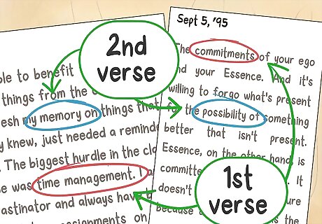 Find a good line in your notes and expand on it. Look through your daily pad or journal entries, free-writing notes, and anything else you’ve written. Depending on how much you write, review your pages daily, every few days, or every week or so. Try to find a good line, phrases, or a paragraph, then work on developing that idea. You may write a week’s worth of entries and find 1 or 2 lines that seem to click. Keep exploring that idea with both free-writing and purposeful writing sessions. Try to come up with passages that further develop the idea. Keep in mind good songs are often conversational. Aim for simplicity, especially when you’re first coming up with lyrics. You can worry about rhymes, rhythms, and colorful imagery later.