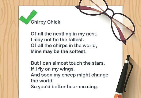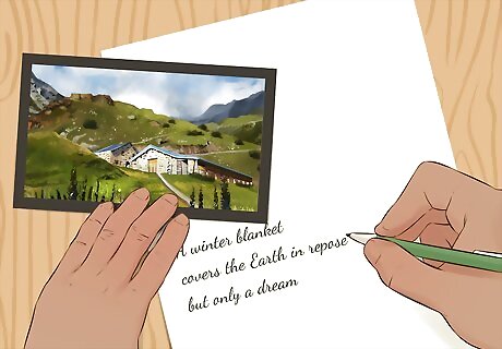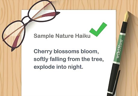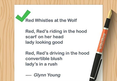 Compose a poem using a literary forms, like sonnet, sestina, or haiku. A literary form, like a sonnet or a sestina, can actually be a great way to get inspired, especially if you are struggling with how to start a poem. Choose a form you’ve never used before, such as a haiku or a rhyming couplets, and challenge yourself to write a poem or a series of poems in that form. You can look up different literary forms and study the guidelines around the form.