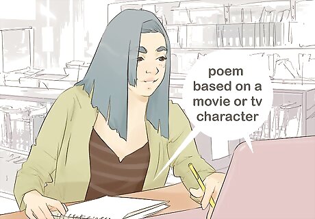 Channel your favorite movie or tv character in a poem. Mix up your point of view by going into the mind of your favorite movie character and writing a poem based on what that character might think, see, feel, and touch in a space. Maybe this is your favorite bad boy movie character from a film, or your favorite sitcom mom on your favorite tv show. Embodying a different perspective could help you create surprising and engaging poetry. You can also try selecting a movie or tv character that you dislike or find unpleasant in some way. You may end up writing a poem that is full of humor and emotion, as you can channel all your dislike into the poem.