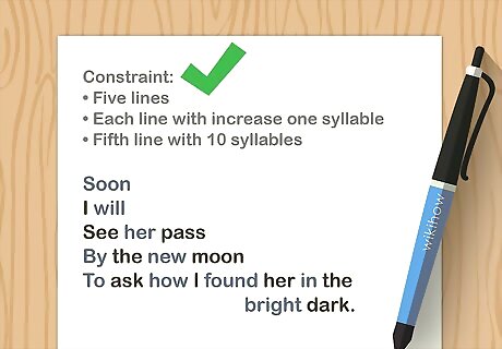 Try a constraints based form. Another way to challenge yourself with limits in your poetry is to use constraint based forms. These forms have set rules or constraints that you must follow to create a piece. You can create your own constraints, such as writing a poem that only uses vowels, or use constraints that have been used by other poets.