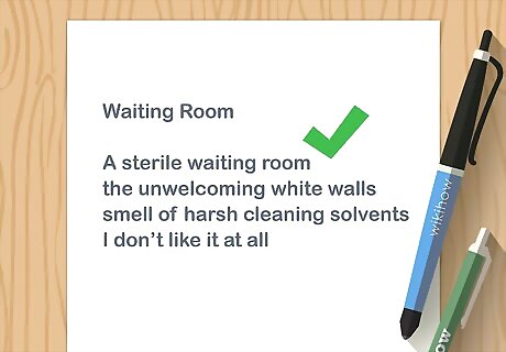 Create a poem about being trapped in a confined space or area. Another inspiring exercise might be to set limitations for your poem by trapping your perspective in a confined space. This could be your bedroom with the door locked, a treehouse in your backyard, or a classroom with no windows. You may then try to write a poem about how it feels to be trapped in the space. You may describe the space itself as well as your emotions when you realize you cannot get out.