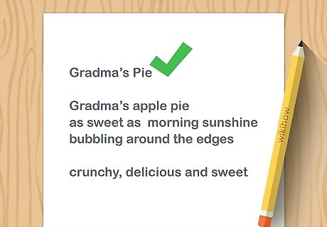 Write a poem in the form of a shopping list or a recipe. Sometimes, approaching poetry in a new form can be a fun experiment and get you inspired. Take a familiar form, like a shopping list or a recipe, and write a poem in that form. You may be surprised by how placing content in a new form can shake up your writing practice and create images you may not have thought of with a more traditional form. You may want to find a shopping list or a recipe you have already written and replace the words with words from a poem. Placing an existing poem in a new form can also change up the meaning in the poem and make the poem more interesting visually.
