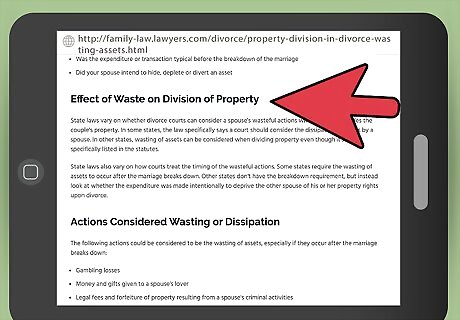 File notice with the court. Inappropriate spending by a spouse during divorce is known legally as "dissipation" of marital assets. In some courts, if you plan to claim dissipation you must file advance notice with the court. If your state law requires you to file notice, it also will provide specific deadlines by which you must file your notice if you want to claim dissipation of assets at trial. For example, in Illinois you must file advance notice with the court at least 60 days before trial. If the discovery process makes this deadline impossible, you can file within 30 days after the date discovery closes. Your notice typically must identify the date when the marriage broke down, the property that your spouse dissipated, and the period of time during which this dissipation occurred. There usually is a maximum period of time for which you can claim dissipation of assets. For example, even if your spouse had a decade-long affair, you may only be able to claim dissipation of assets for inappropriate expenditures made within a few years prior to the date the divorce petition was filed. This period of time may be shorter if you knew or reasonably should have known that the dissipation was occurring.