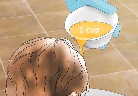Pour orange juice over your child's head. You will need to use 1 cup of 100% pure orange juice. Do not use orange juice from concentrate. Carefully pour the orange juice over your child's head. Massage it in with your fingertips, making certain that the orange juice covers all of your child's hair. You can use fresh-squeezed orange juice if you prefer, but make sure that you strain out the pulp. It may be easier to buy some pulp-free orange juice to minimize your work, since this process is already quite intensive.