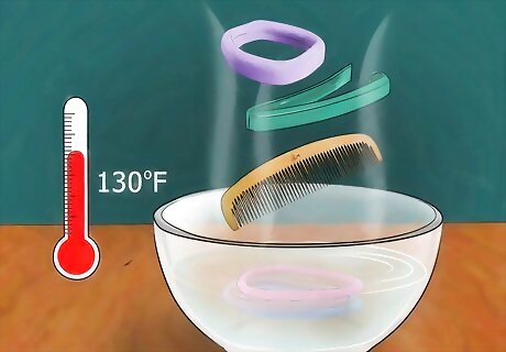 Soak hair tools, ties, and barrettes in very hot water. Use very hot water (at least 130°F or 54.4°C) to soak all of your hair tools and other hair items. Let them sit in the solution for about 10 minutes. This should kill the lice on these items. You can also use isopropyl alcohol to soak these items. Another option is to dispose of the infested hair tools and go out and buy new ones. Make sure that each child has his or her own personal comb and/or brush.