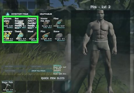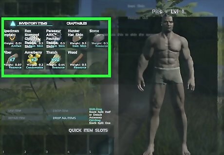 Find food. So, your probably getting hungry, right? You can gather some food! Get berries: If you go up so a small bush, and begin to press △ /Y/E without a tool equipped, you begin to 'harvest' this bush, granting you fiber and different berries. All of these berries can be eaten, but they won't fill up hardly any hunger, so watch out! Get meat: If you want any chance of surviving, you're going to have to kill things for food. It's just impossible to live off only berries. Here are three animals that are perfect for beginners: Dodos, Lystrosaurus, and Moschops. Run up to one and repeatedly hit it with an axe. Once it is dead, keep hitting it until its corpse disappears. You will have gotten meat and hide. Now, go over to the fire, put your meat and wood in the campfire and light it. Eventually you'll be left with cooked meat! Eat this as you need it.