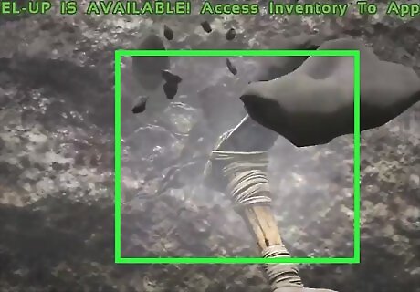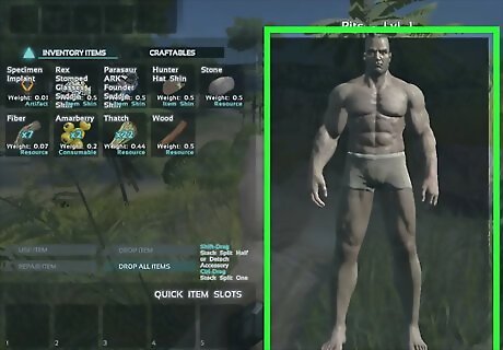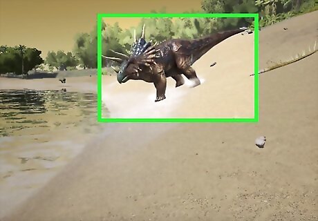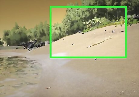 Survey the scene. As soon as you get up, and scratch at the strange implant in your arm, look around you. You'll probably be on a beach, with a thick jungle behind you and an endless ocean in front of you. Look around for resources (large boulders and tall trees) and try to spot predators. There may be some rocks on the ground that you can press E on and you would be able to pick them up without having to punch any big rocks and hurt yourself. Keep an eye out for giant crocodiles, anything that looks like a raptor, or anything with a T-rex shaped body. If you see anything, just be aware that they could notice you too! If anything is too close, you might need to move homes.