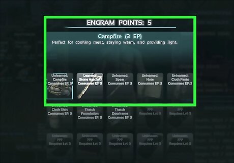 Pick your engrams. Now that you have a pick, go swinging at some of those giant boulders with the pickaxe! You'll walk away with plenty of stone and flint. By now, you should have leveled up. Go into your inventory and under your character, there is a list of stats. Select one to increase (health, food, water, crafting speed, stamina, melee damage, etc). It will bring you into the Engram List. Here are all the things you can craft in the whole game. Some you must be a certain level to unlock. For now, chose to learn campfire and axe. Craft these.