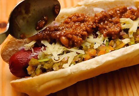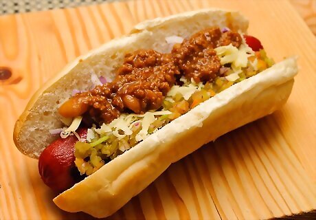 Load your dog. When the bun's done, drop your dog in, and add condiments to your heart's desire. Here are some ideas for toppings: Mustard—golden, yellow, gray, searing, smooth, or seedy. Hot dogs love it. Ketchup—the old standby. Pickle relish—dill, sweet, however you like it. Raw onions—green, white, yellow, or sweet, it's all good! Grilled onions—the only thing better than raw onions. Grilled peppers—is there anything grilled peppers don't taste good on? Cheese—add a little, add a lot. Pepper jack is a nice change from cheddar or processed cheese, though processed cheese has a really nice melt to it. Chili—this makes it a little harder to eat with your hands, but it is delicious. Barbecue sauce—adds to that smokey barbecue thing you have going on here. Steak sauce—tired of ketchup? kick it up a notch. Hot sauce—kick it up a couple more notches. Sauerkraut—yes, it was nasty when you were a kid. Try it now! Pretty much anything that'll fit on a bun that you like. Okay, maybe not rocky road ice cream, but you know what we mean!