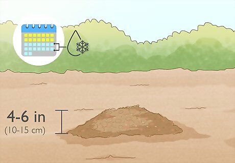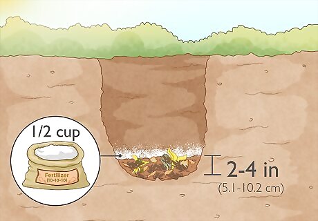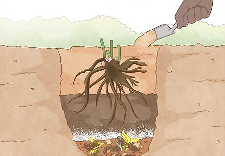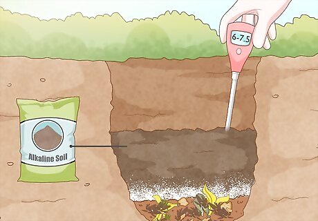 Fill each hole halfway with neutral to slightly alkaline soil with a pH of 6-7.5. Regardless of whether you’re using a store-bought soil or your yard’s soil, any soil will work so long as it is well-draining and has a pH balance of 6-7.5. On top of the compost and fertilizer, add enough soil to fill your hole halfway. Tip: PH refers to the acidity of the soil. You can check a soil’s pH balance by reading the label. If you want to check the pH contents of your garden, get a digital pH reader and insert the probe into the ground to test it.