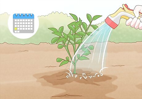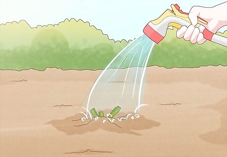 Water your plants immediately after planting them to help the soil settle. Once you’ve planted your peonies, water the soil. Spray the planting area with water for 5-10 seconds using a wide-nozzle setting. This will help the soil settle around the roots and ensure that your roots are comfortable.Tip: You do not need to water your peonies over the winter. Begin watering again after you remove the mulch in spring.