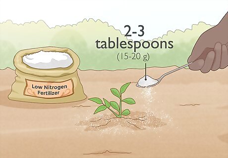 Add a low-nitrogen fertilizer to your soil when the stems emerge. Get a fertilizer that is low in nitrogen from your local gardening store. As spring progresses, you’ll soon notice stems sticking out of the ground. When the stems get to be around 2–3 inches (5.1–7.6 cm) high, sprinkle 2-3 tablespoons (15-20 g) of fertilizer into the soil and mix it with your top soil by hand or with a trowel.Tip: If you want to produce bigger flowers, clip the bud at the top of the stem as soon as you see it. Removing the top bud will reduce the weight at the top of the plant as it grows, causing the plant to grow wider instead of taller. You may not see any stems emerge from the soil for the first 1-2 years.
