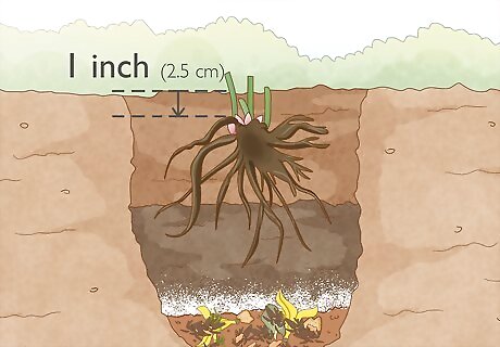 Place your roots on top of the soil with the roots facing down. With your hole filled halfway with soil, place your roots in the center of the hole with the stem facing up. Gently work the individual roots down into the soil. The top of your root should sit 1–2 inches (2.5–5.1 cm) below the surface of the hole. If you put your peonies in backwards with the roots on top, they won’t grow.