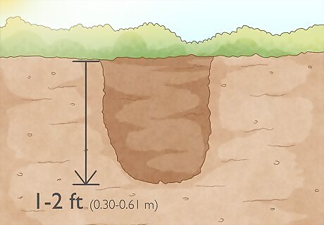 Dig each planting hole 1–2 ft (0.30–0.61 m) into the ground. Use a spade to dig at least 1 ft (0.30 m) into the ground. Make each individual hole 12–18 in (30–46 cm) wide. Dig a round hole for each individual plant that you’re putting in your garden. You can use a shovel or trowel instead of a spade if you prefer. It won’t make a difference. If you’re planting a peony in a pot, use a pot with several drainage holes that is at least 1 ft (0.30 m) wide and 1 ft (0.30 m) deep.