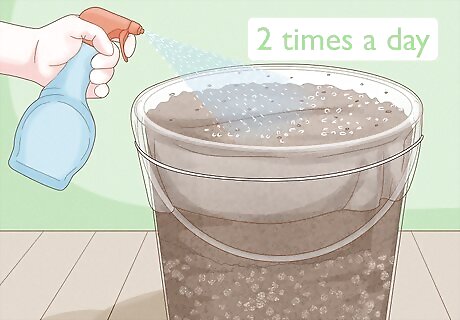 Spray the top of the grounds with water. The grounds should be misted twice a day. You can spray the mushrooms through the holes in the plastic wrap, or you can remove the wrap temporarily to spray the grounds, then replace it when you are finished.